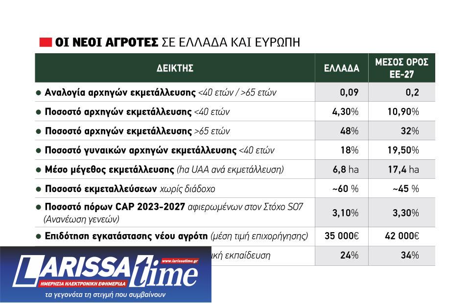 Το ποσοστό αρχηγών εκµετάλλευσης κάτω των 40 ετών φτάνει µόλις το 4,3%, µε την Ελλάδα στην 25η θέση. Συνεπώς, η χώρα ανήκει στην οµάδα µε «πολύ χαµηλό µερίδιο νέων αγροτών».