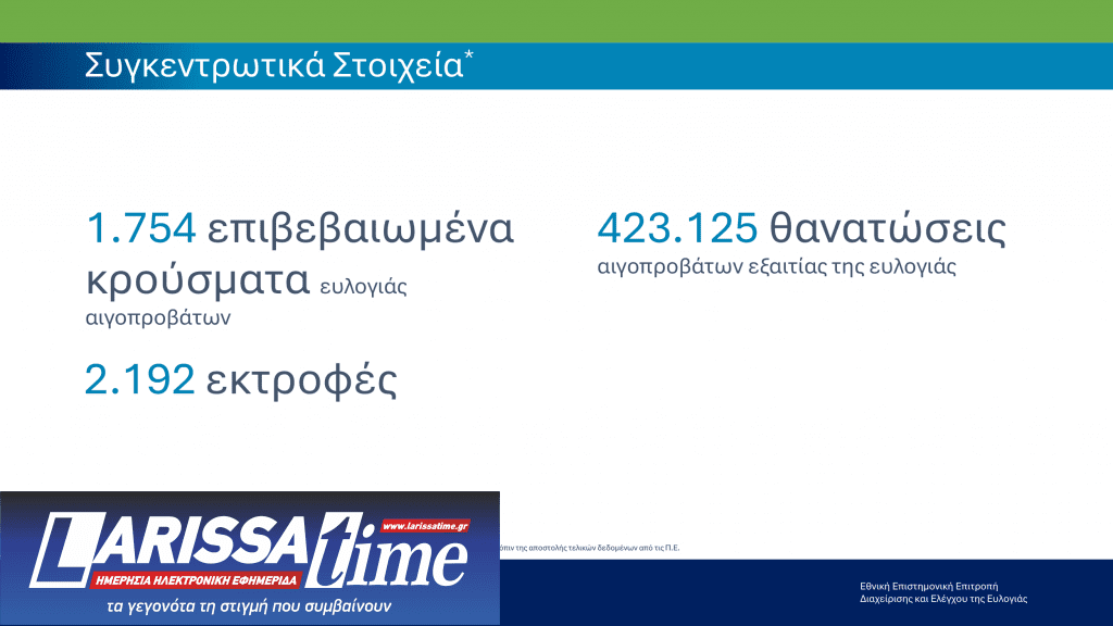 Παράλληλα, σύμφωνα με τα στοιχεία, για το διάστημα από τον Αύγουστο 2024 έως και τις 23 Νοεμβρίου 2025 έχουν καταγραφεί 1.754 επιβεβαιωμένα κρούσματα ευλογιάς αιγοπροβάτων σε 2.192 εκτροφές σε όλη τη χώρα, ενώ έχουν θανατωθεί 423.125 ζώα, στο πλαίσιο εφαρμογής των προβλεπόμενων υγειονομικών πρωτοκόλλων.