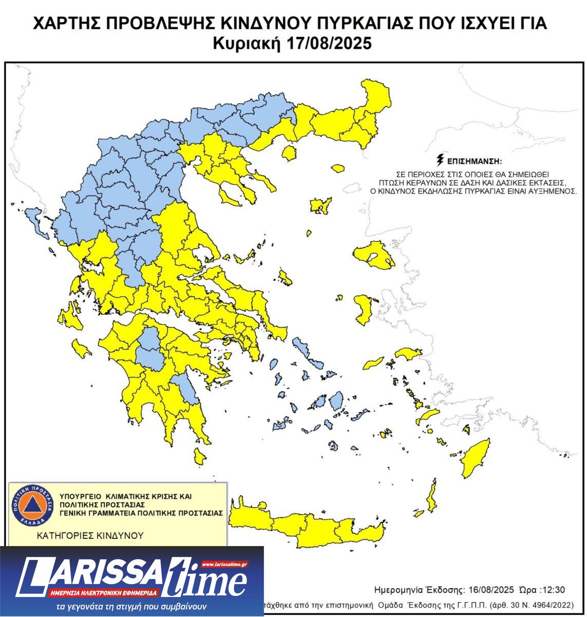 Όπως προβλέπεται με τον Ημερήσιο Χάρτη Πρόβλεψης Κινδύνου Πυρκαγιάς της Γενικής Γραμματείας Πολιτικής Προστασίας, οι Σποράδες είναι σε κατάσταση κινητοποίησης (Red Code), ενώ για την Π.Ε. Μαγνησίας & Σποράδων και για περιοχές της Π.Ε. Λάρισας προβλέπεται κατηγορία κινδύνου 3 (υψηλή).