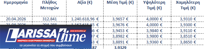 Η «Τράπεζα Eurobank Ανώνυμη Εταιρεία» (εφεξής η «Eurobank» ή η «Τράπεζα»), σε συνέχεια της από 12.12.2025 ανακοίνωσής της σχετικά με την έναρξη εφαρμογής του Προγράμματος Επαναγοράς Ιδίων Μετοχών («Πρόγραμμα»), το οποίο εγκρίθηκε με την απόφαση της Έκτακτης Γενικής Συνέλευσης των Μετόχων της Τράπεζας στις 22.10.2025, σύμφωνα με το άρθρο 49 του ν. 4548/2018, σε συνέχεια του αντίστοιχου προγράμματος της «Eurobank Ergasias Υπηρεσιών και Συμμετοχών Ανώνυμη Εταιρεία» («Eurobank Holdings») που θεσπίστηκε με την απόφαση της από 30.04.2025 Τακτικής Γενικής Συνέλευσης των Μετόχων της τελευταίας, και σε συνέχεια της από 22.10.2025 απόφασης του Διοικητικού Συμβουλίου της, ενημερώνει το κοινό ότι κατά το διάστημα 20.04.2026 – 24.04.2026 απέκτησε συνολικά, στο πλαίσιο του Προγράμματος, 1.528.806 μετοχές εκδόσεως της ιδίας («Ίδιες Μετοχές») που διαπραγματεύονται στο Χρηματιστήριο Αθηνών («Χ.Α.»), με μέση τιμή κτήσης €3,9329 ανά μετοχή και συνολικό κόστος €6.012.639,87.