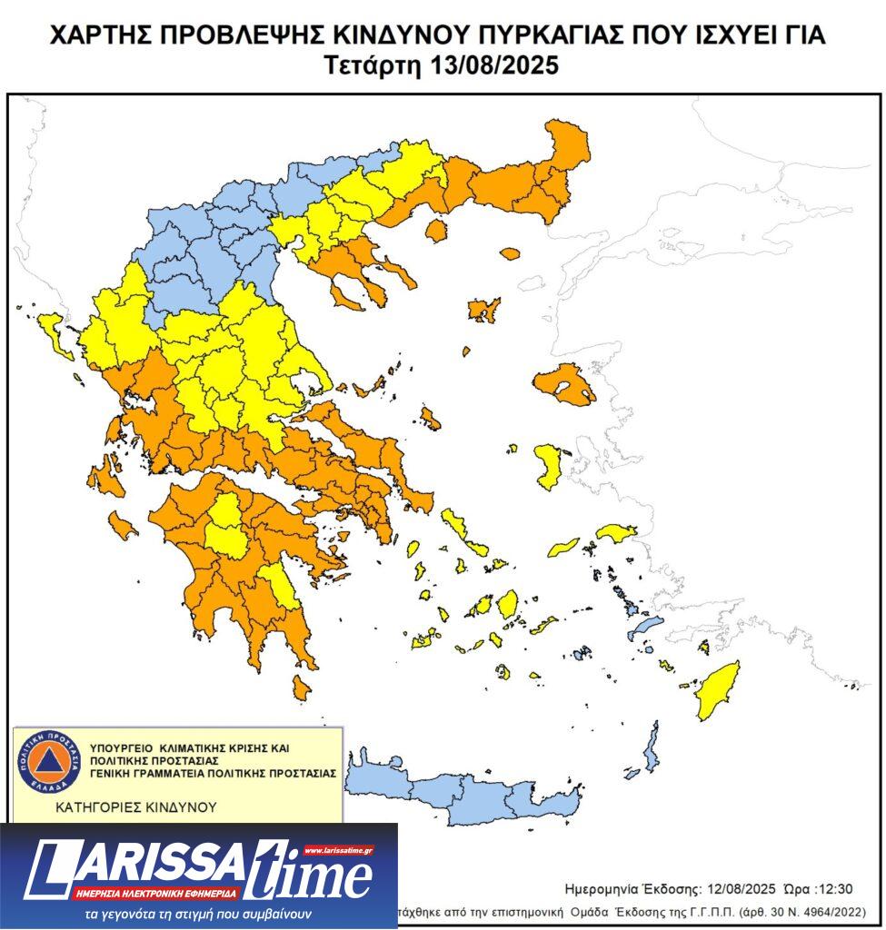 Όπως προβλέπεται με τον Ημερήσιο Χάρτη Πρόβλεψης Κινδύνου Πυρκαγιάς της Γενικής Γραμματείας Πολιτικής Προστασίας, για σήμερα Τετάρτη 13 Αυγούστου 2025, προβλέπεται Κατηγορία Κινδύνου 3 (υψηλή) για όλη την Περιφέρεια Θεσσαλίας και Κατηγορία Κινδύνου 4 (πολύ υψηλή) για τις Σποράδες.