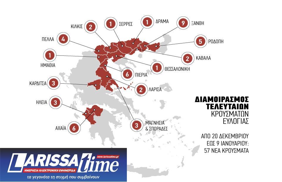 Για την περίοδο αναφοράς 20 Δεκεμβρίου 2025 – 9 Ιανουαρίου 2026 καταγράφηκαν 57 νέα κρούσματα σε 16 περιοχές, βάσει των αποτελεσμάτων των εργαστηριακών ελέγχων.
