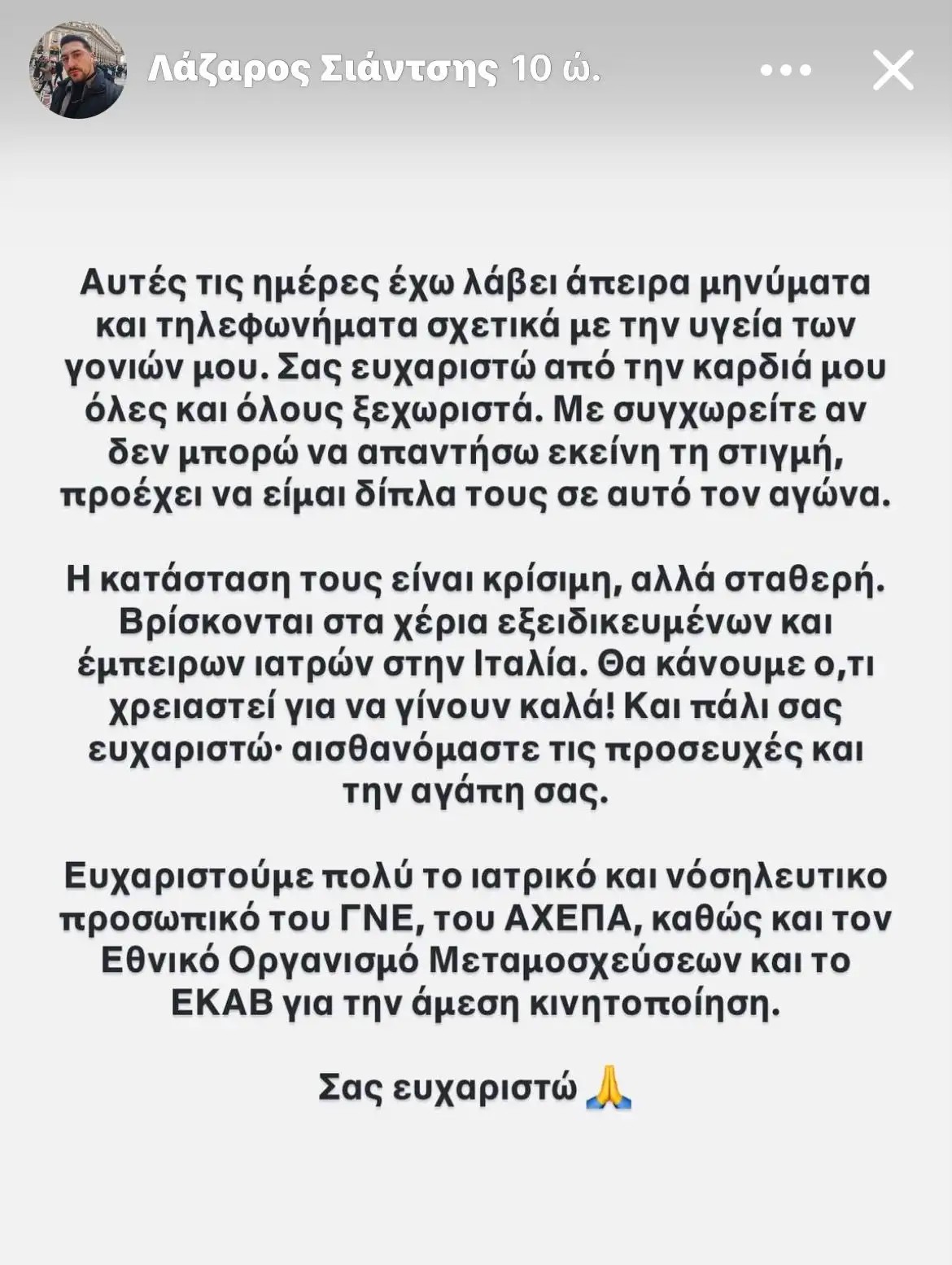Ο γιος του ζευγαριού έκανε μια συγκινητική ανάρτηση στα κοινωνικά δίκτυα, εκφράζοντας την ευγνωμοσύνη του προς τους γιατρούς και το νοσηλευτικό προσωπικό των ελληνικών νοσοκομείων, αλλά και σε όλους όσοι στηρίζουν την οικογένειά του αυτές τις δύσκολες ώρες. Στην ανάρτησή του ενημέρωσε ότι οι γονείς του παραμένουν σε κρίσιμη αλλά σταθερή κατάσταση και βρίσκονται υπό τη φροντίδα εξειδικευμένων και έμπειρων γιατρών στην Ιταλία.