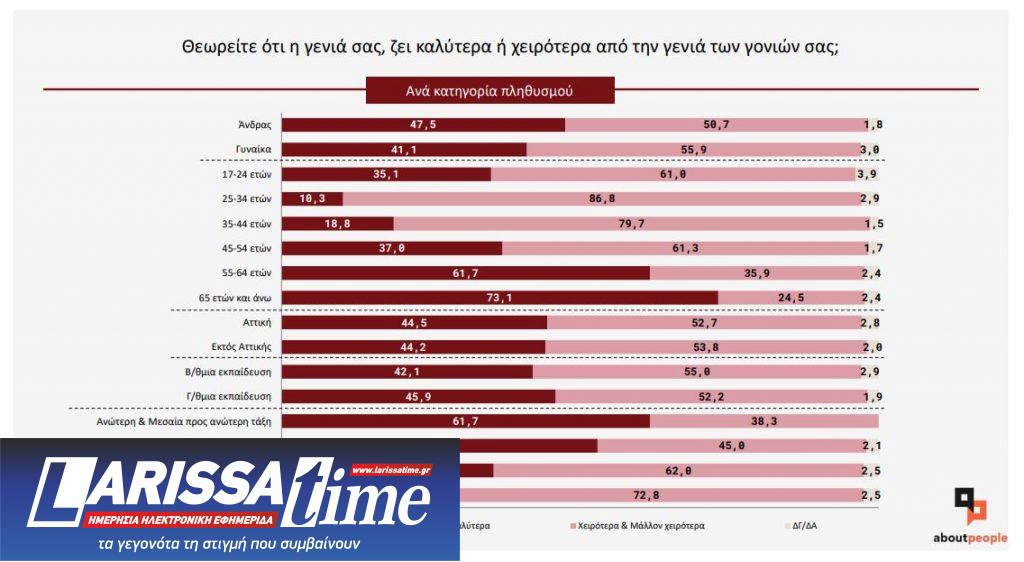 Οι πολίτες παρουσιάζονται απαισιόδοξοι για το μέλλον. Το 53,3% θεωρεί ότι η σημερινή γενιά ζει χειρότερα από αυτήν των γονιών της. Το 72% εκτιμά ότι η τα παιδιά 10-17 ετών θα ζήσουν χειρότερα από τη σημερινή γενιά.