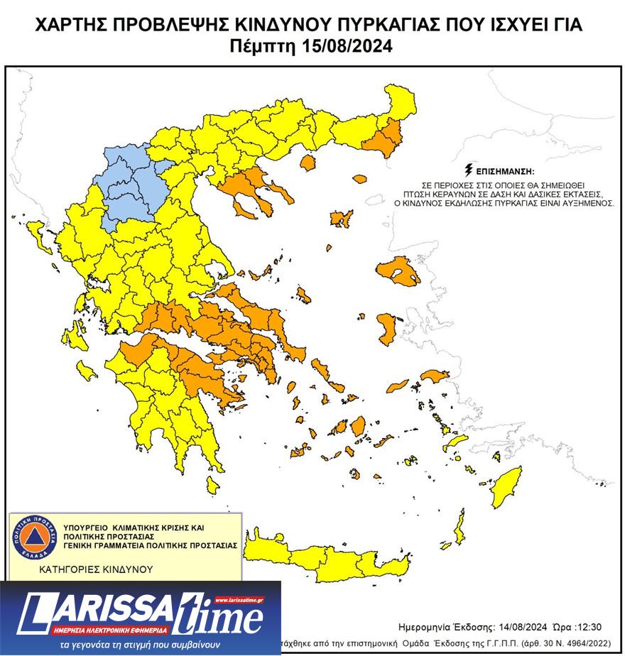 ⚠️ Χάρτης Πρόβλεψης Κινδύνου 🔥 για αύριο Πέμπτη 15/08: