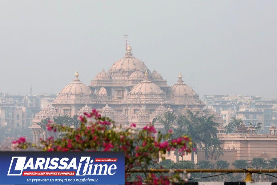 Ο ινδουιστικός ναός «Swaminarayan Akshardham» τυλιγμένος σε πυκνό νέφος στο Νέο Δελχί, μετά την εορτή «Ντιβάλι» και την εκτεταμένη χρήση πυροτεχνημάτων στις 21 Οκτωβρίου, 2025.