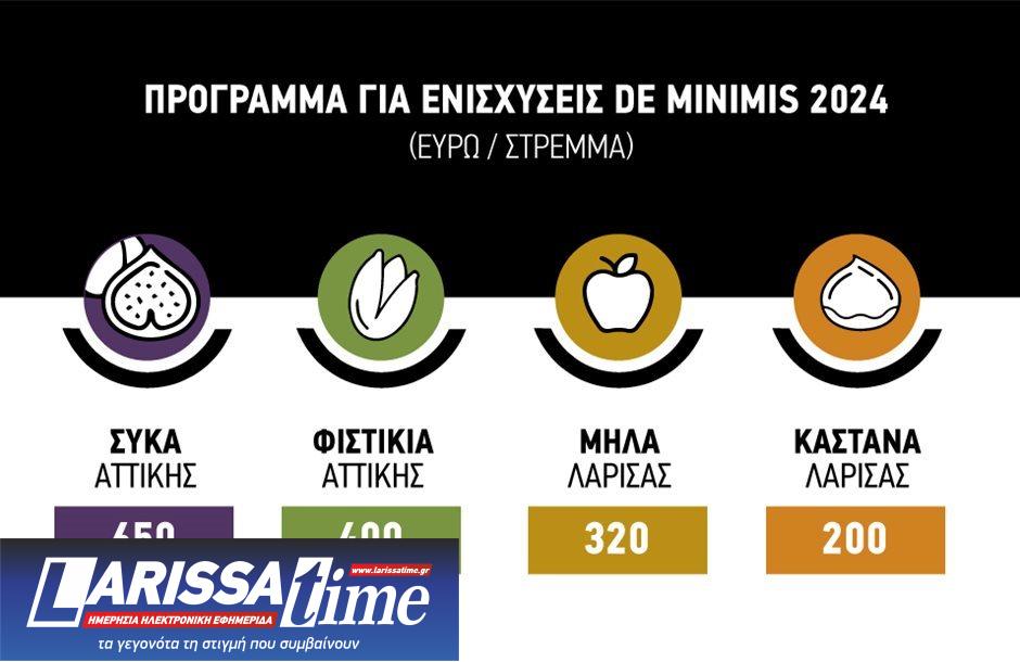 - Μήλων της Αγιάς και Ελασσόνας της Π.Ε. Λάρισας, με ύψος του ποσού ενίσχυσης ήσσονος σημασίας 320€ ανά στρέμμα καλλιέργειας μήλων για τους κατά κύριο επάγγελμα αγρότες, ενώ στην περίπτωση των μη κατά κύριο επάγγελμα αγροτών, η εν λόγω ενίσχυση, προς την πληττόμενη αγροτική εκμετάλλευση περιορίζεται στο 50% του ποσού που θα λάβουν οι κατά κύριο επάγγελμα αγρότες.