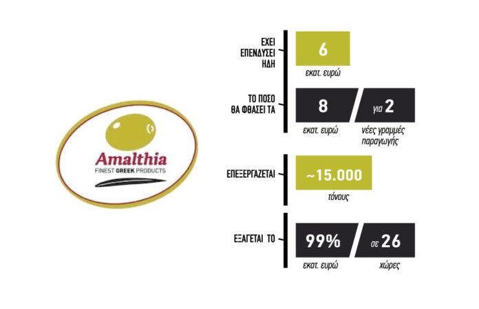 «Είµαστε καθετοποιηµένη µονάδα. Παραλαµβάνουµε την ελιά από τον παραγωγό κατευθείαν και κάνουµε την επεξεργασία της. Να τη διαλογήσουµε, να την καθαρίσουµε, να την καταστήσουµε βρώσιµη και µετά να την την εκπυρηνώσουµε  ή να τη γεµίσουµε και να την κόψουµε σε κοµµάτια, σε φέτες, για να συσκευαστεί και να φτάσει στον καταναλωτή, αλλά και στη µεγάλη αγορά του HORECA. Στόχος µας να γίνουµε ακόµα πιο σύγχρονοι και δυνατοί στο retail, στο επώνυµο  και στη µικρή συσκευασία», τονίζει η κ. Ζούκα και αποκαλύπτει πως «πουλάµε µε δικά µας brand, αλλά και πελατών». Ετησίως η Αµάλθεια ΑΕ επεξεργάζεται περίπου 15.000 τόνους επιτραπέζια ελιά όλων των ποικιλιών αλλά «ναυαρχίδες» είναι η Καλαµών και η Πράσινη Χαλκιδικής, που µοιράζονται ισοµερώς σε όγκο παραγωγής και αξία. Ο εµπορικός προσανατολισµός είναι αµιγώς εξαγωγικός, αφού το 99% των προϊόντων κατευθύνεται σε 26 διαφορετικές χώρες.