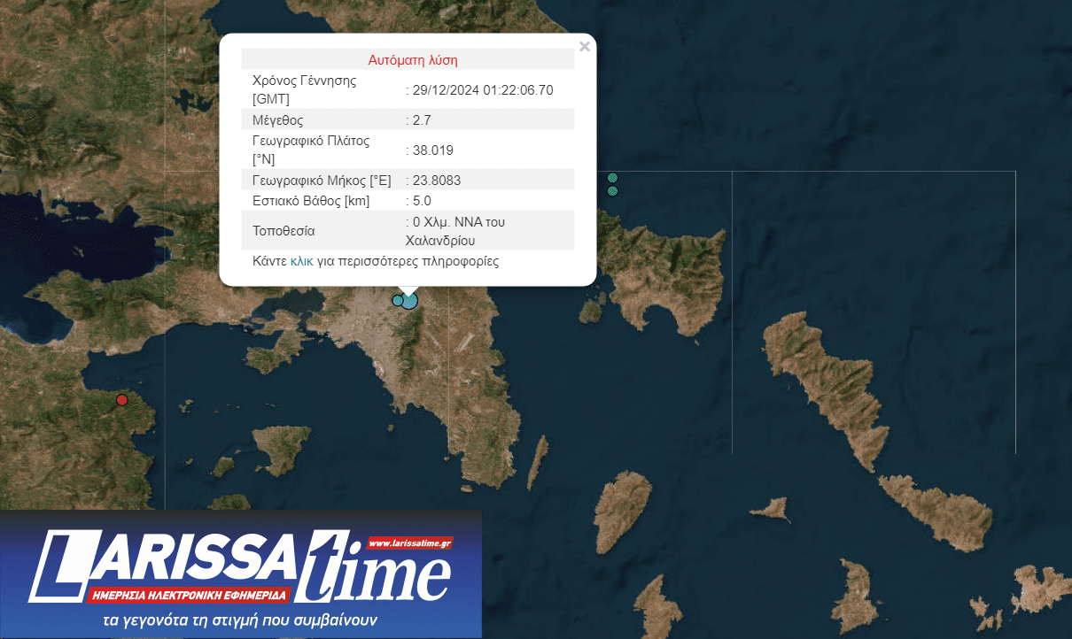 Σεισμός μεγέθους 2,7 βαθμών της Κλίμακας Ρίχτερ σημειώθηκε στις 3:22 τα ξημερώματα της Κυριακής (29/12) στην περιοχή του Χαλανδρίου στην Αττική.