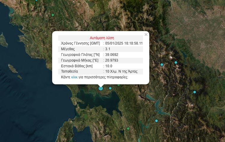Σεισμός 3,1 Ρίχτερ σημειώθηκε πριν από λίγο στην Άρτα.