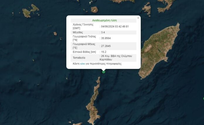 Σεισμός 3,4 Ρίχτερ σημειώθηκε νωρίς το πρωί της Τρίτης (04/06), μεταξύ Καρπάθου και Ρόδου.