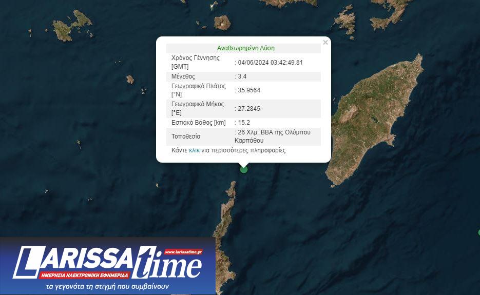 Σύμφωνα με το Γεωδυναμικό Ινστιτούτο, το εστιακό βάθος εντοπίζεται στα 15,2 χιλιόμετρα και το επίκεντρο στα 26 χιλιόμετρα Βόρεια-Βορειοανατολικά της Ολύμπου Καρπάθου.