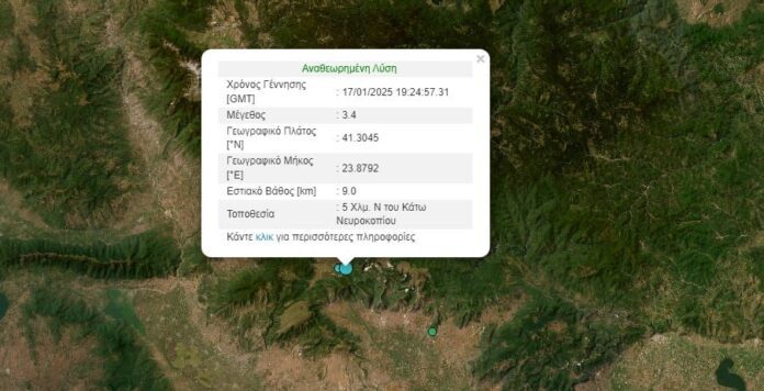 Σεισμός μεγέθους 3,4 βαθμών της κλίμακας Ρίχτερ σημειώθηκε το βράδυ της Παρασκευής (17/1) με επίκεντρο 5 χιλιόμετρα νότια του Κάτω Νευροκοπίου Δράμας και εστιακό βάθος 9 χλμ.