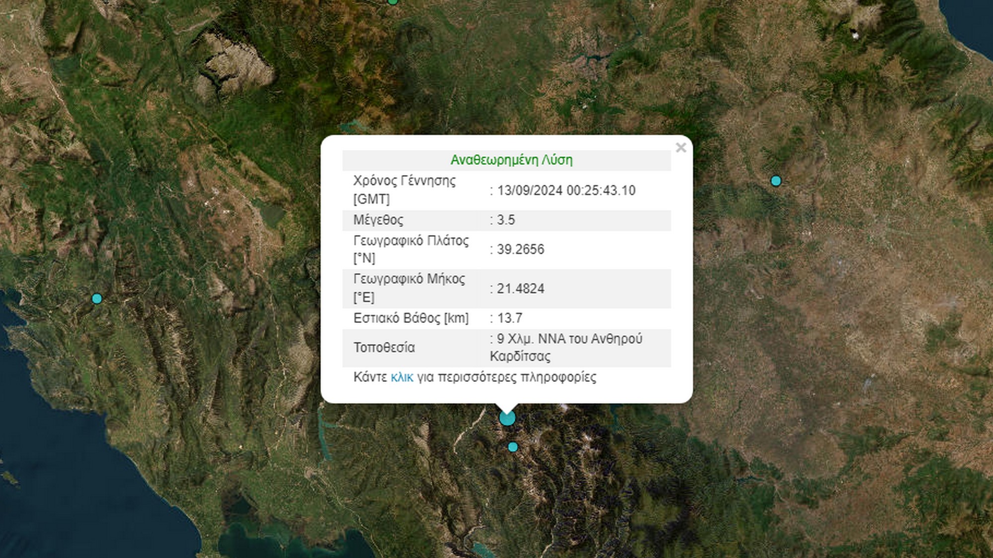 Σεισμός 3,5 Ρίχτερ μεταξύ Καρδίτσας και Άρτας