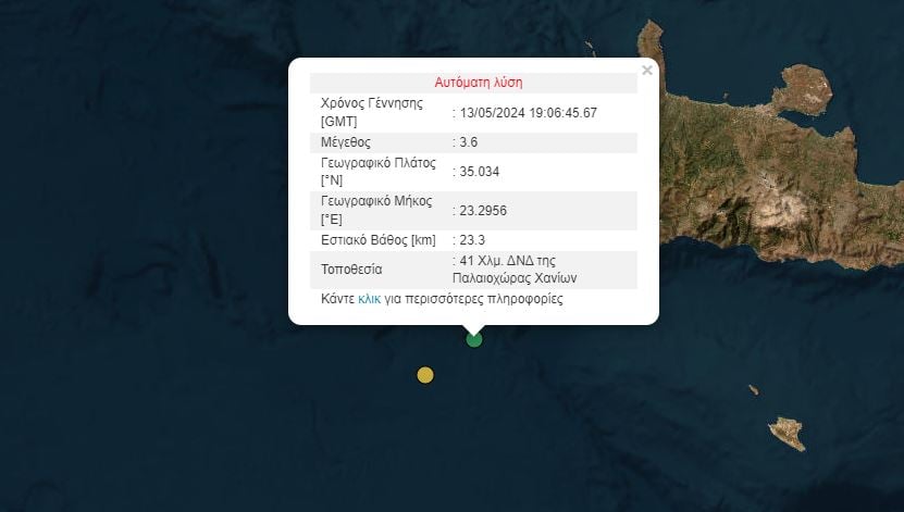 Σύμφωνα με την αυτόματη λύση του Γεωδυναμικού Ινστιτούτου Αθηνών, το επίκεντρο του σεισμού εντοπίζεται 41 χιλιόμετρα δυτικά-βορειοδυτικά της Παλαιόχωρας Χανίων, ενώ το εστιακό βάθος εκτιμάται στα 23,3 χιλιόμετρα.