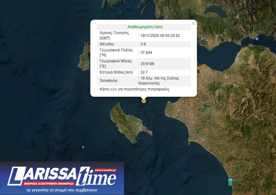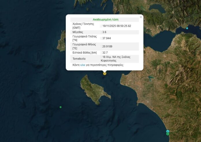 Σεισμός σημειώθηκε το πρωί της Τετάρτης (19/11) στον θαλάσσιο χώρο ανοιχτά της Κεφαλονιάς.
