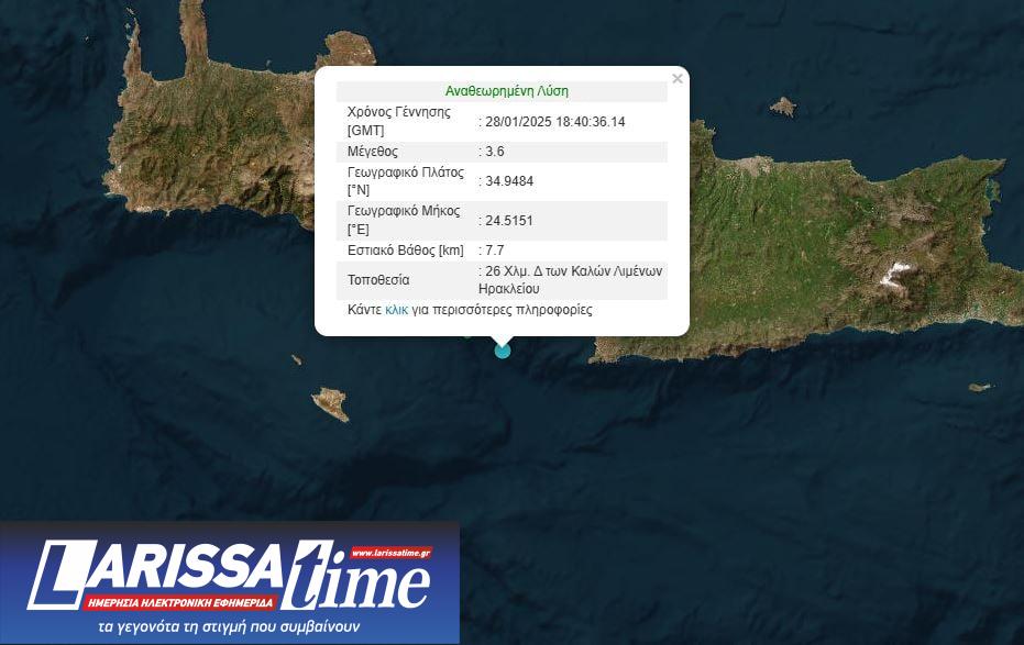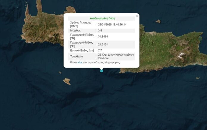 Σεισμός έγινε πριν από λίγη ώρα ανοιχτά της Κρήτης. Σύμφωνα με την αναθεωρημένη λύση του Γεωδυναμικού Ινστιτούτου, ο σεισμός είχε μέγεθος 3,6 Ρίχτερ.