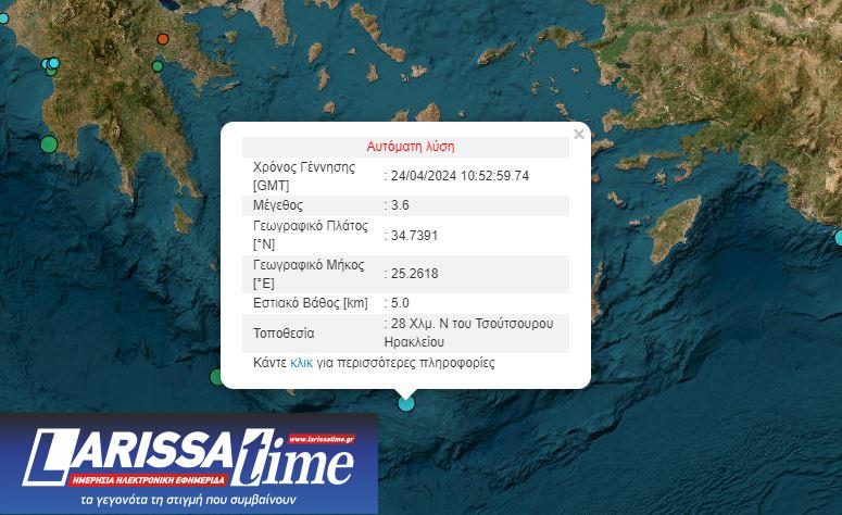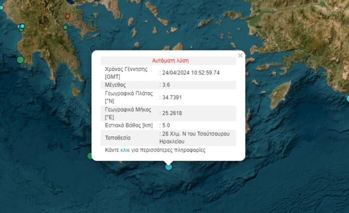 Σεισμός 3,6 βαθμών της κλίμακας Ρίχτερ σημειώθηκε πριν από λίγο στη θαλάσσια περιοχή ανοιχτά της Κρήτης.