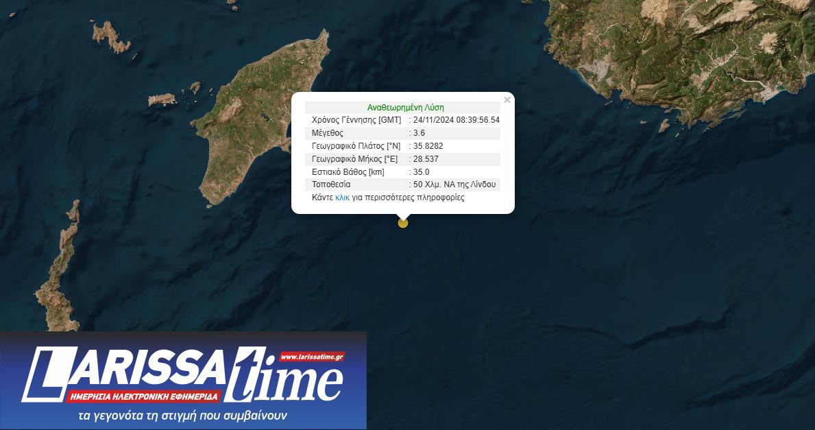 Σεισμός μεγέθους 3,6 Ρίχτερ σημειώθηκε σήμερα Κυριακή (24/11) στις 10.39 το πρωί στη θαλάσσια περιοχή κοντά στη Λίνδο.
