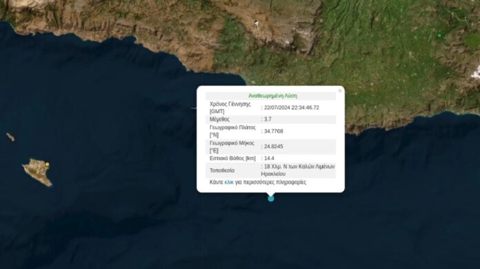 Σεισμός μεγέθους 3,6 Ρίχτερ έγινε στις 01:34 τα ξημερώματα της Τρίτης (23/7), στη νότια Κρήτη.
