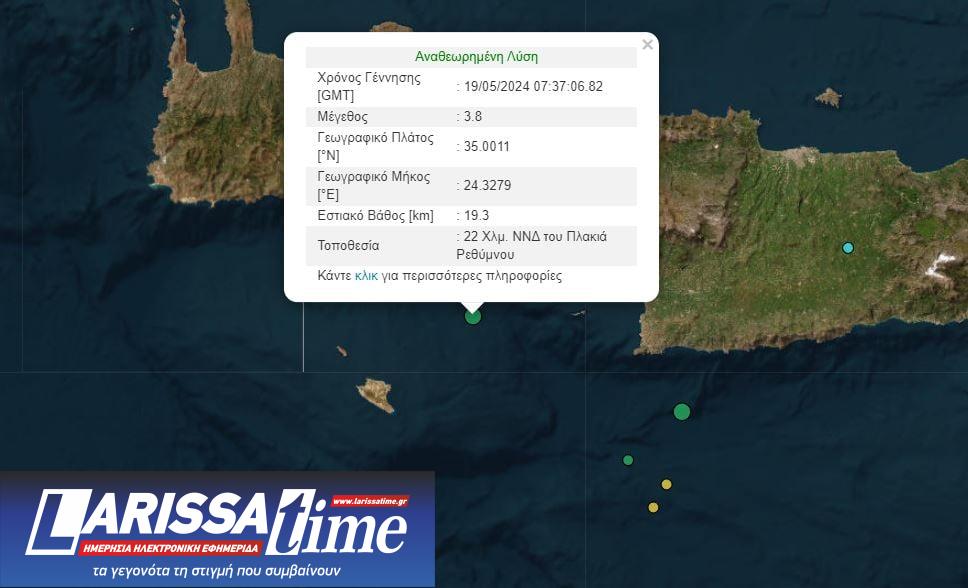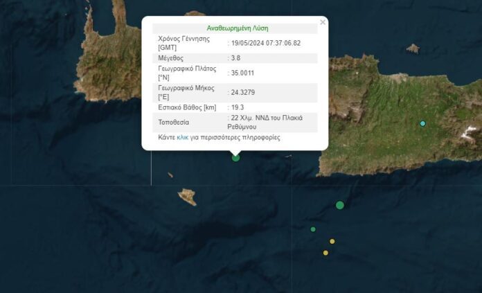 Σεισμός μεγέθους 3,8 βαθμών της κλίμακας Ρίχτερ σημειώθηκε ανοιχτά του Ρεθύμνου, στην Κρήτη.  Σύμφωνα με το Γεωδυναμικό Ινστιτούτο, ο σεισμός είχε επίκεντρο θαλάσσια περιοχή 22 χιλιόμετρα νοτιοδυτικά του Πλακιά Ρεθύμνου, ενώ το εστιακό βάθος υπολογίζεται σε 19 χιλιόμετρα.