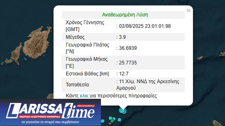 Σεισμός 3,9 βαθμών της κλίμακας Ρίχτερ σημειώθηκε στις 02:01 τα ξημερώματα της Κυριακής (3/8), στον θαλάσσιο χώρο της Αμοργού.