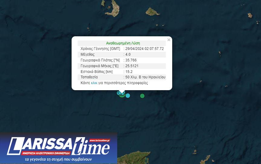 Σεισμική δόνηση μεγέθους 4 βαθμών της κλίμακας Ρίχτερ, σημειώθηκε στις 05:07 στον θαλάσσιο χώρο του Ηρακλείου Κρήτης. Νωρίτερα σημειώθηκαν δύο διαδοχικές σεισμικές δονήσεις μέσα σε μισή ώρα.