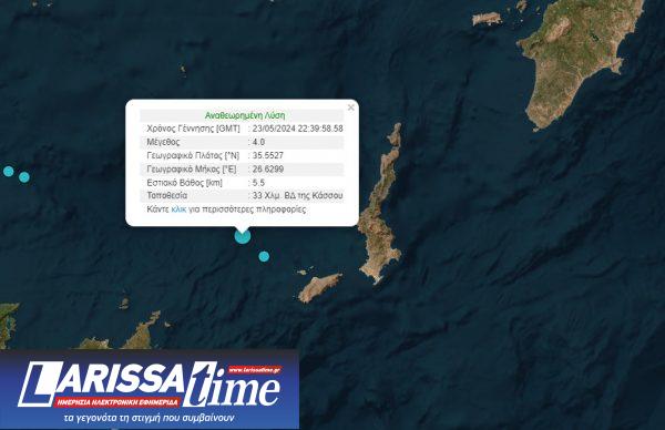 Σύμφωνα με ανακοίνωση του Γεωδυναμικού Ινστιτούτου του Εθνικού Αστεροσκοπείου Αθηνών, οι σεισμογράφοι του κατέγραψαν στις 01:39 σήμερα Παρασκευή σεισμική δόνηση το επίκεντρο της οποίας εντοπίστηκε στον υποθαλάσσιο χώρο 33 χιλιόμετρα βορειοδυτικά της Κάσσου, ή 374 χιλιόμετρα νοτιοανατολικά της Αθήνας.