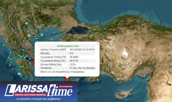 Σύμφωνα με το Γεωδυναμικό Ινστιτούτο του Εθνικού Αστεροσκοπείου Αθηνών, ασθενής σεισμική δόνηση 4 Ρίχτερ καταγράφηκε στις 00:33 σήμερα Τρίτη, με το επίκεντρό της να εντοπίζεται σε απόσταση 31 χιλιομέτρων νοτιοδυτικά της Νισύρου, ή 333 χλμ. ανατολικά-νοτιοανατολικά της Αθήνας.