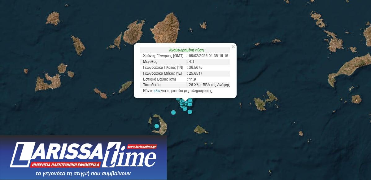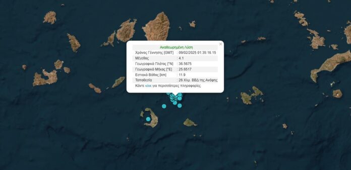 Νέος σεισμός 4,1 βαθμών της κλίμακας Ρίχτερ σημειώθηκε στις 3:35 στη θαλάσσια περιοχή βόρεια βορειοδυτικά της Ανάφης.