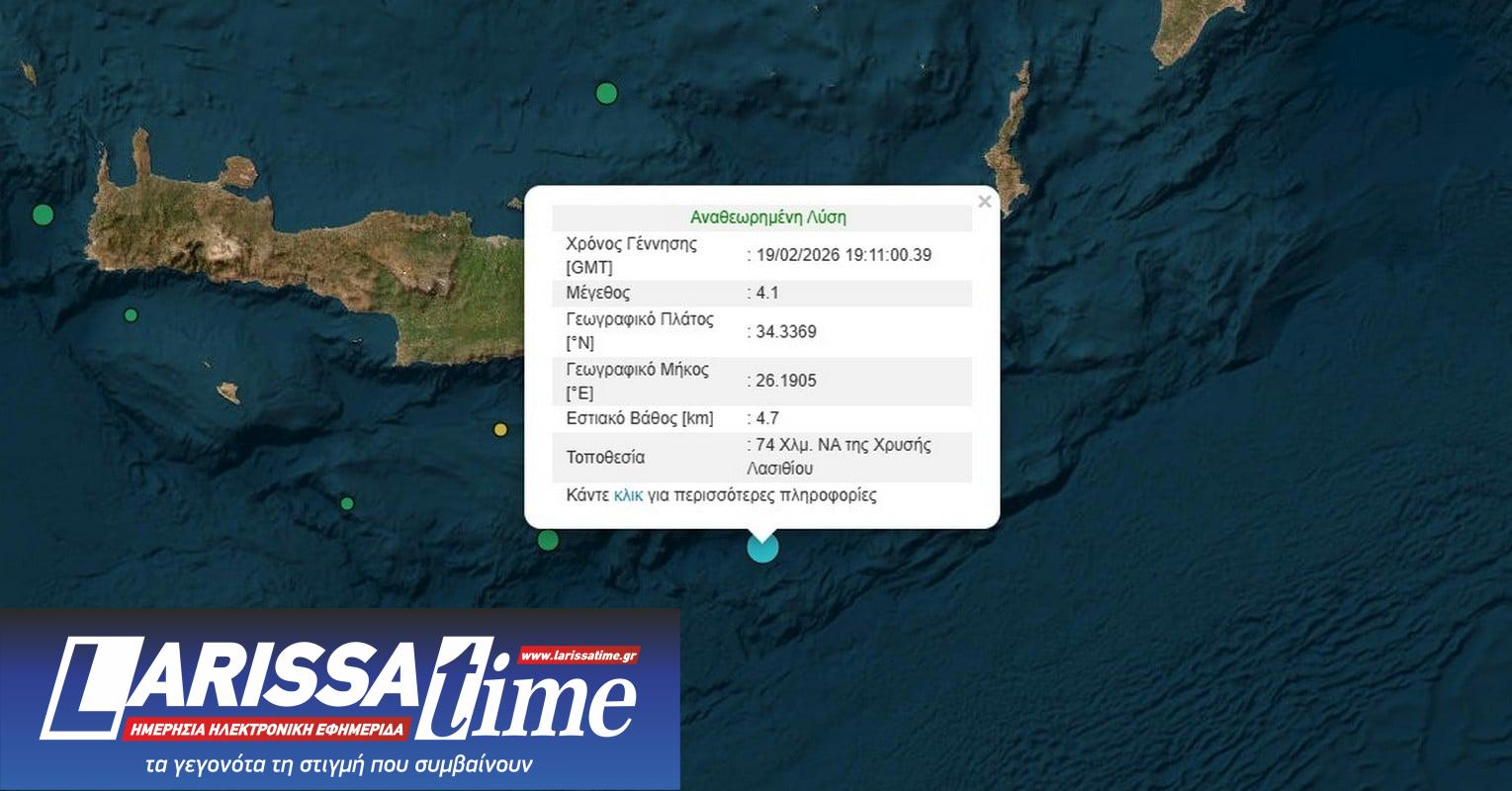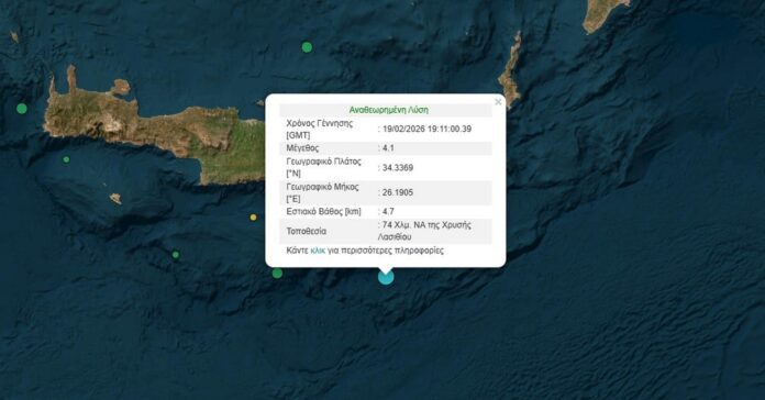 Μια ασθενής αλλά αισθητή σεισμική δόνηση μεγέθους 4,1 Ρίχτερ καταγράφηκε στις 21:11 το βράδυ της Πέμπτης, στη θαλάσσια περιοχή νότια του νομού Λασιθίου. Οι ειδικοί εκτιμούν ότι ο συγκεκριμένος σεισμός εντάσσεται στη συνήθη σεισμικότητα της περιοχής, χωρίς προς το παρόν να εμπνέει ανησυχία.