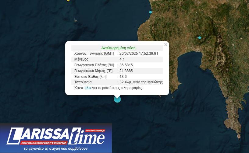 Σεισμός 4,1 Ρίχτερ σημειώθηκε το απόγευμα της Πέμπτης (20/02) ανοιχτά της Μεθώνης.