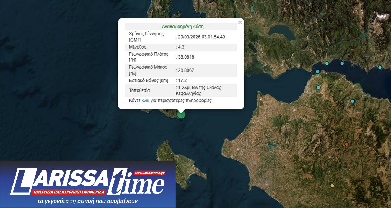 Σεισμός 4,3 βαθμών της κλίμακας Ρίχτερ σημειώθηκε τα ξημερώματα της Κυριακής 29/3 στην Κεφαλονιά.