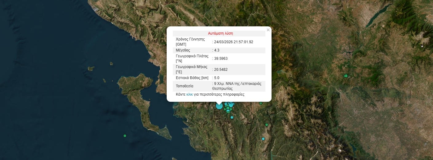 Σεισμός μεγέθους 4,3 Ρίχτερ σημειώθηκε τα μεσάνυχτα της Τρίτης στην Θεσπρωτία.