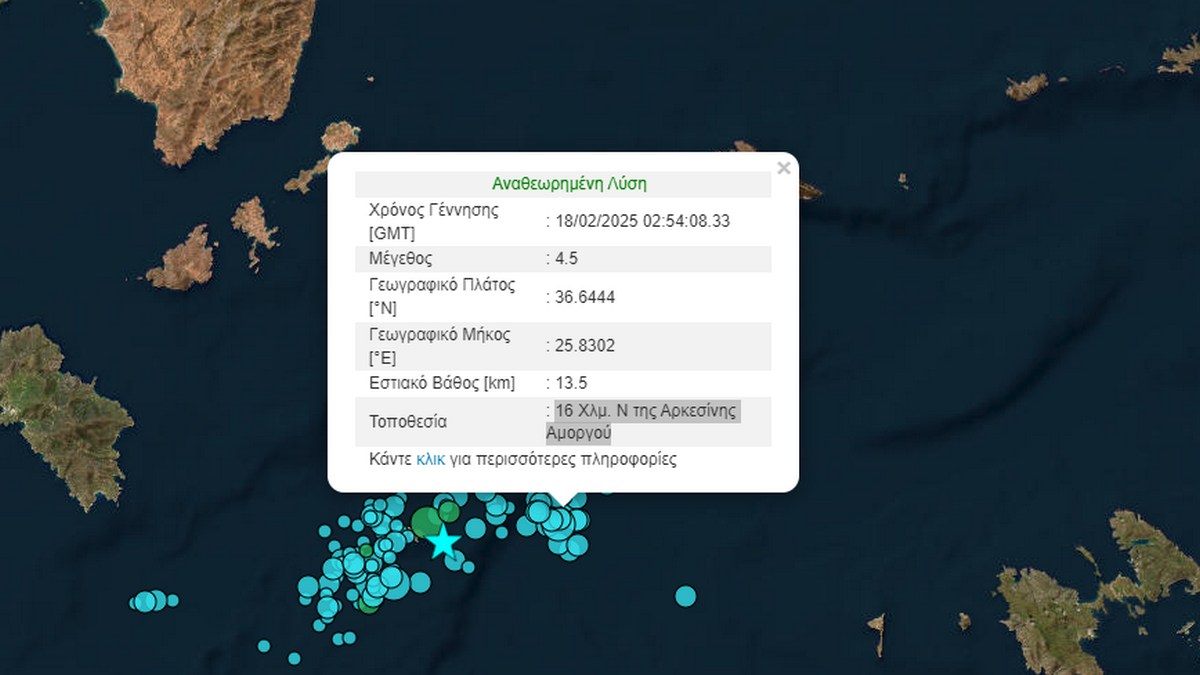 Σύμφωνα με το Γεωδυναμικό Ινστιτούτο το επίκεντρο της δόνησης εντοπίζεται στα 13 χλμ. Νότια της Αρκεσίνης Αμοργού, ενώ το εστιακό βάθος υπολογίζεται στα 13,5 χλμ.