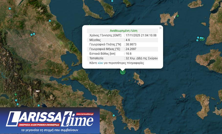 Σεισμός έντασης 4,6 βαθμών της κλίμακας Ρίχτερ σημειώθηκε πριν από λίγο στη θαλάσσια περιοχή ανοικτά της Σκύρου. Η σεισμική δόνηση έγινε αισθητή και στην Αττική.