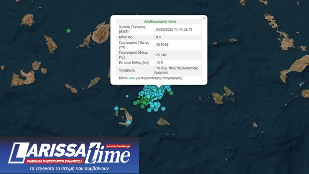 Συνεχίζεται η σεισμική δραστηριότητα στις Κυκλάδες με νέο σεισμό 4,6 Ρίχτερ, 18 χιλιόμετρα ΝΝΔ της Αρκεσίνης Αμοργού. Ο σεισμός σημειώθηκε στις 19.44 και αρχικά, σύμφωνα με την αυτόματη λύση του Γεωδυναμικού Ινστιτούτου, το επίκεντρο ήταν περίπου 63 χιλιόμετρα δυτικά – βορειοδυτικά της Ολύμπου Καρπάθου. Άμεσα υπήρξε διόρθωση με το σωστό επίκεντρο του σεισμού που βρίσκεται ανάμεσα σε Σαντορίνη και Αμοργό.