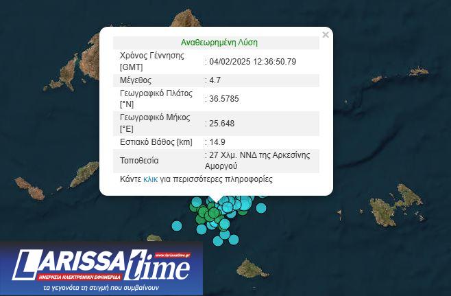 Συγκεκριμένα, η δόνηση σημειώθηκε στις 14:36 και είχε μέγεθος 4,7 Ρίχτερ, σύμφωνα με την αναθεωρημένη λύση του Γεωδυναμικού Ινστιτούτου του Εθνικού Αστεροσκοπείου Αθηνών.