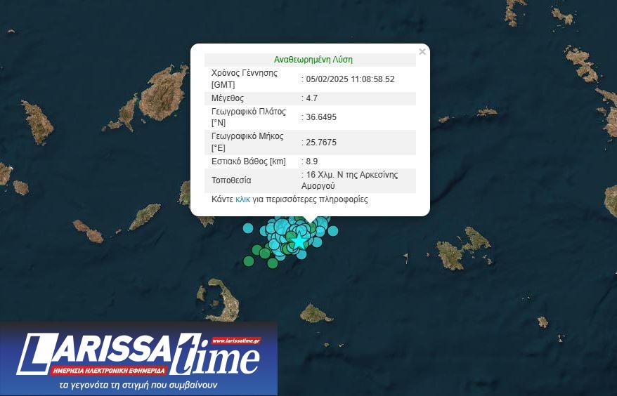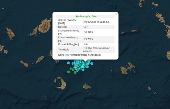 Δεν έχουν τέλος οι σεισμικές δονήσεις στις Κυκλάδες. Νέος σεισμός έγινε νότια – νοτιοανατολικά της Αμοργού. Αρχικά η αυτόματη λύση του Γεωδυναμικού Ινστιτούτου Αθηνών έδωσε μέγεθος 4,8 Ρίχτερ και στη συνέχεια 4,6 Ρίχτερ. Η αναθεωρημένη λύση έδωσε μέγεθος 4,7 Ρίχτερ.