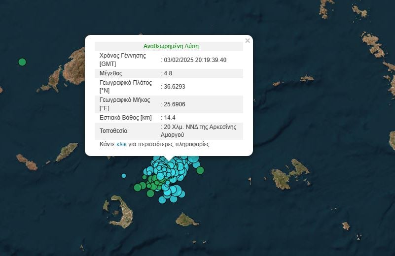 Νέος σεισμός 4,8 Ρίχτερ σημειώθηκε το βράδυ της Δευτέρας (3/2) ανοιχτά της Αμοργού.