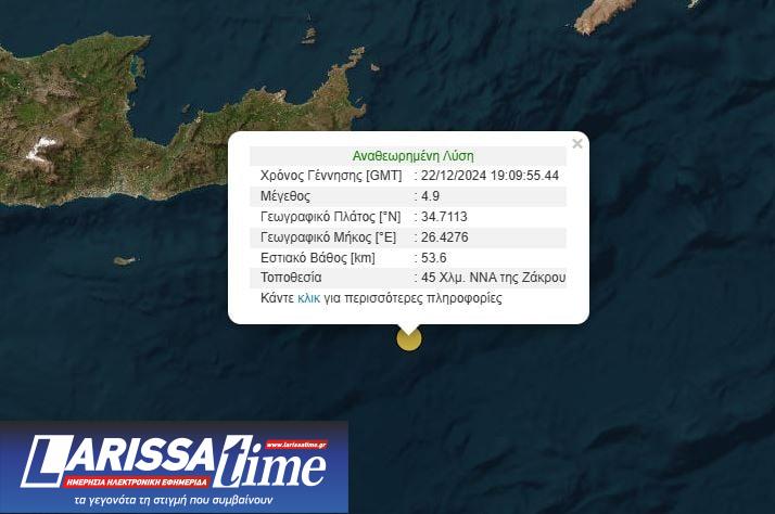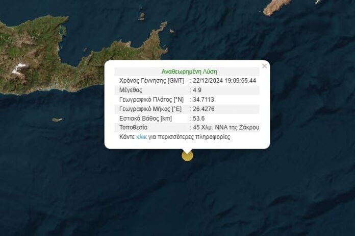 Σεισμός 4,9 Ρίχτερ σημειώθηκε το βράδυ της Κυριακής 22/12/2024 ανοιχτά της Κρήτης.