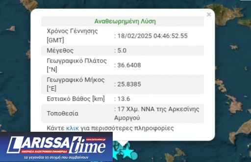 Νέος ισχυρός σεισμός μεγέθους 5,1 Ρίχτερ σημειώθηκε πριν από λίγα λεπτά, το πρωί της Τρίτης (18/02), ανοιχτά της Αμοργού.