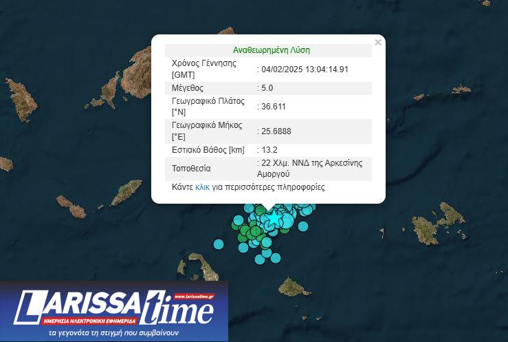 Σεισμός εντάσεως 5 της κλίμακας Ρίχτερ σημειώθηκε στις 15:04 με επίκεντρο 22 χλμ νότια,νοτιοδυτικά της Αρκεσίνης Αμοργού.