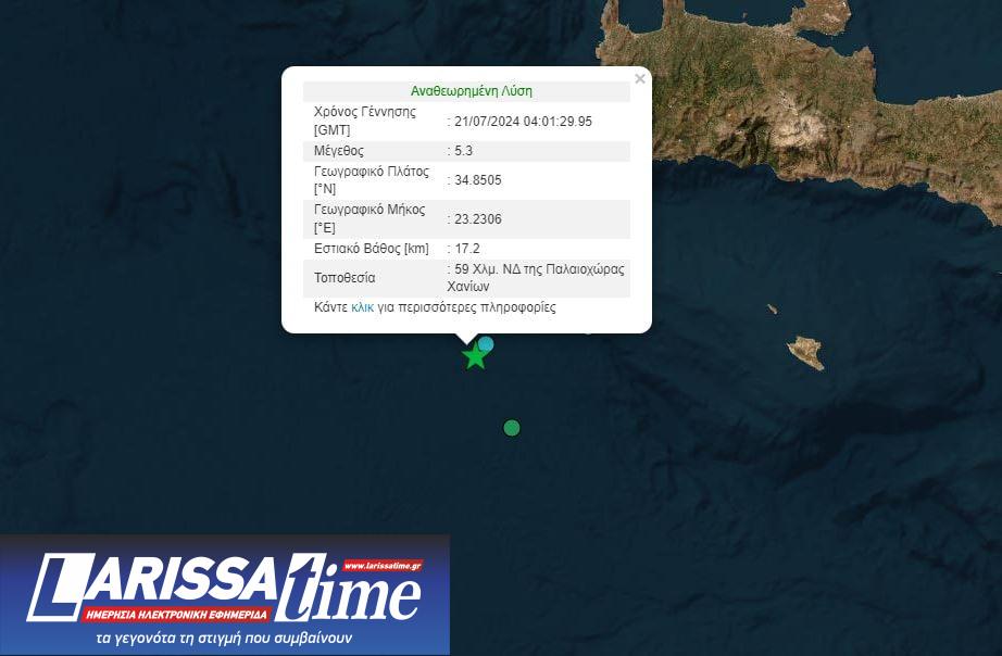 Σεισμός μεγέθους 5,3 Ρίχτερ έγινε πριν από λίγο στα Χανιά. Σύμφωνα με το Γεωδυναμικό Ινστιτούτο Αθηνών, ο σεισμός έγινε 59 χιλιόμετρα νοτιοδυτικά της Παλαιοχώρας και είχε εστιακό βάθος 17,2 χιλιόμετρα.