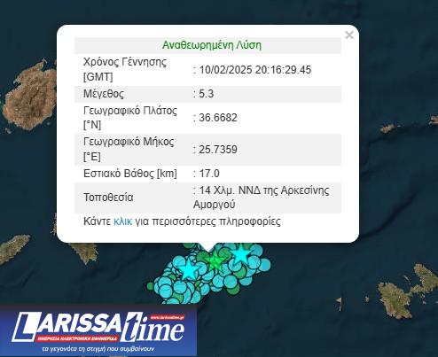 Τελικά, ο σεισμός ήταν μεγέθους 5,3 βαθμών της κλίμακας Ρίχτερ, με επίκεντρο στα 14 χιλιόμετρα νότια-νοτιοδυτικά της Αρκεσίνης Αμοργού και εστιακό βάθος στα 17 χιλιόμετρα.