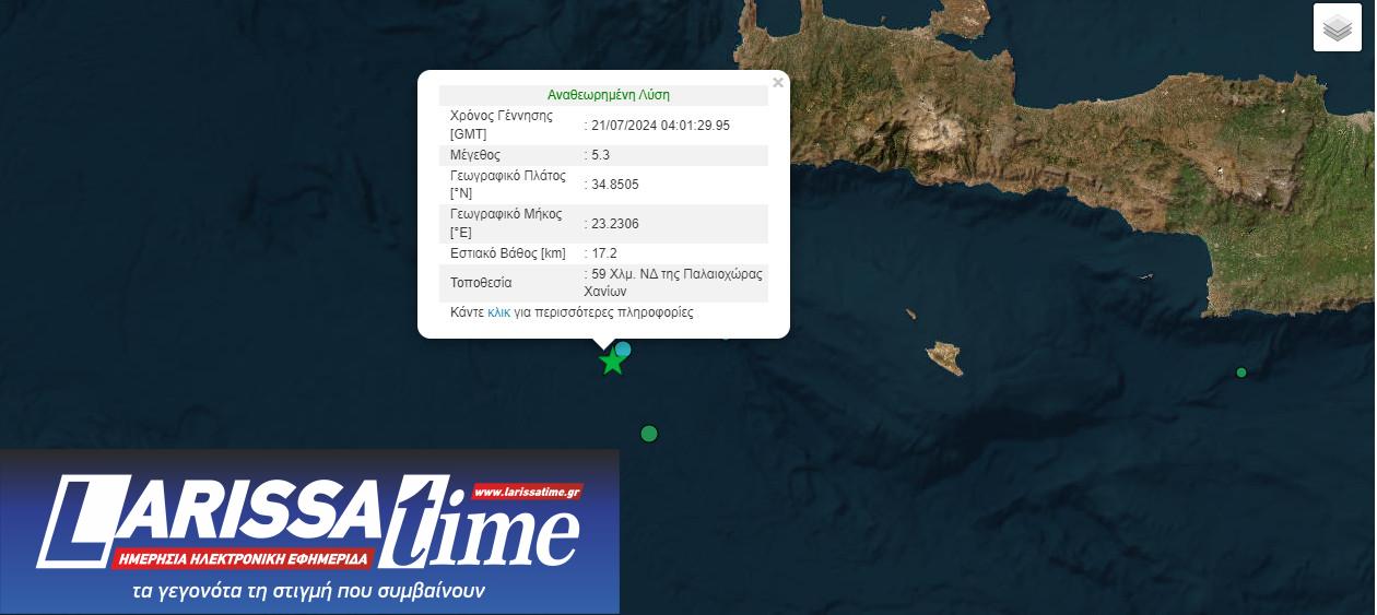 Σεισμός μεγέθους 5,3 Ρίχτερ σημειώθηκε σήμερα (21/7) στις 7 το πρωί σε θαλάσσια περιοχή, 59 χιλιόμετρα νοτιοδυτικά της Παλαιοχώρας Χανίων στην Κρήτη.