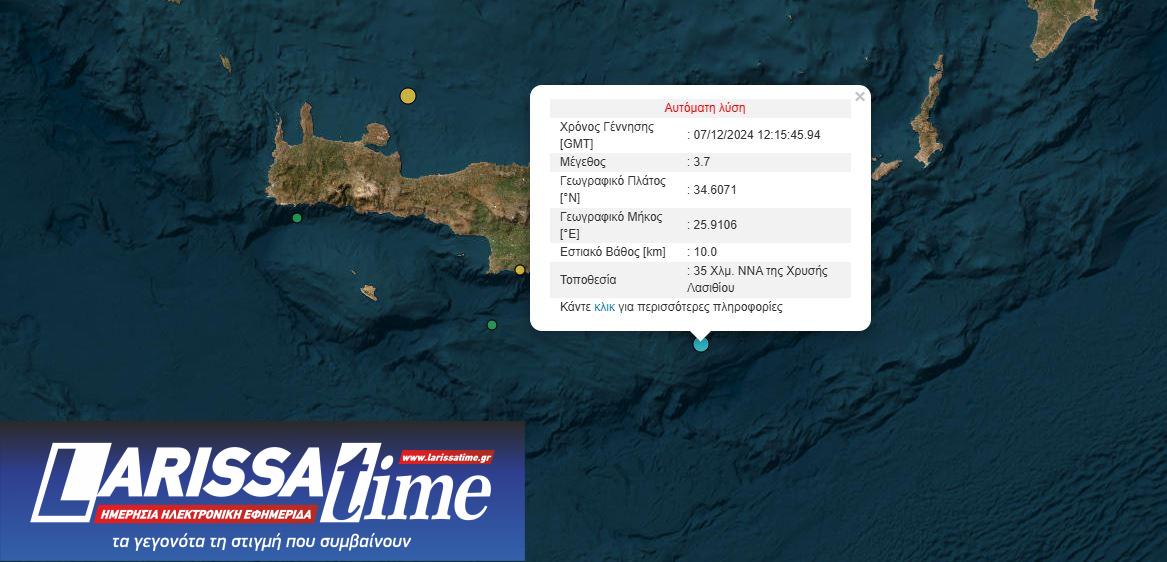 Συγκεκριμένα ο σεισμός σημειώθηκε 35χλμ νοτιοανατολικά της περιοχής Χρυσή Λασιθίου.