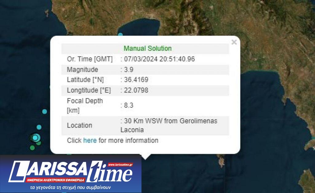 Σεισμός σημειώθηκε στις 22:51 το βράδυ της Πέμπτης (7/3) στη θαλάσσια περιοχή ανοιχτά του Γερολιμένα Λακωνίας.