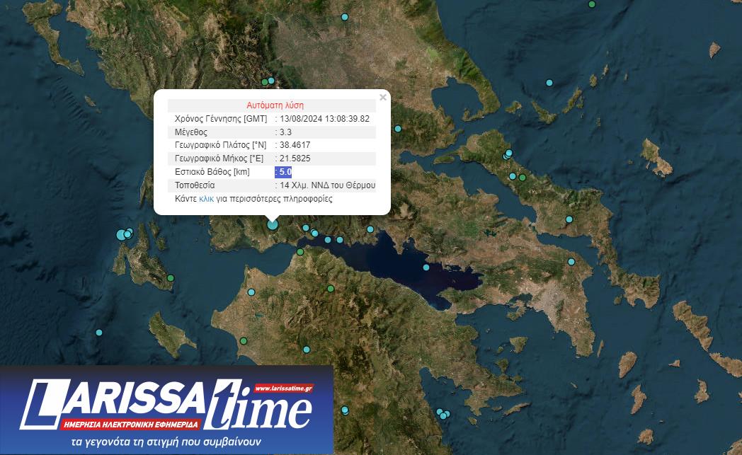 Σύμφωνα με το Γεωδυναμικό Ινστιτούτο, ο σεισμός καταγράφηκε στις 16.08 σήμερα το απόγευμα, στα 14 χιλιόμετρα νότια – νοτιοδυτικά του Θέρμου Αιτωλοακαρνανίας.