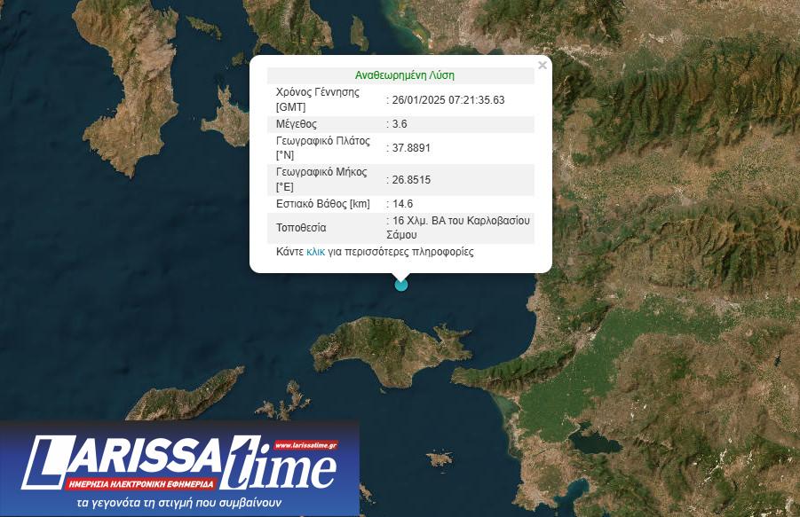 Το επίκεντρο εντοπίζεται στα 16 χιλιόμετρα βορειοανατολικά από το Καρλόβασι.